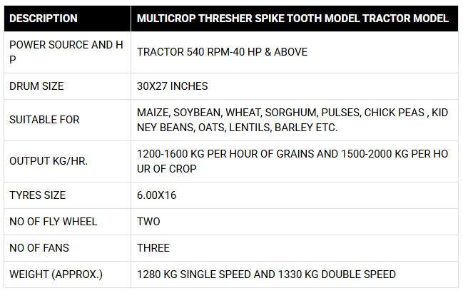 Multicrop Thresher Spike Tooth Model (Tractor-Powered) is a high-efficiency machine engineered for threshing a wide variety of crops, including maize, soybeans, peas, chickpeas, barley, sorghum, lentils, wheat, beans, and pulses. Powered by a tractor, this model boasts a robust build and versatile functionality, ensuring exceptional performance across diverse crop types. Its durable design and advanced threshing mechanism make it a reliable choice for farmers seeking to streamline their operations and increase productivity with a single, adaptable machine.